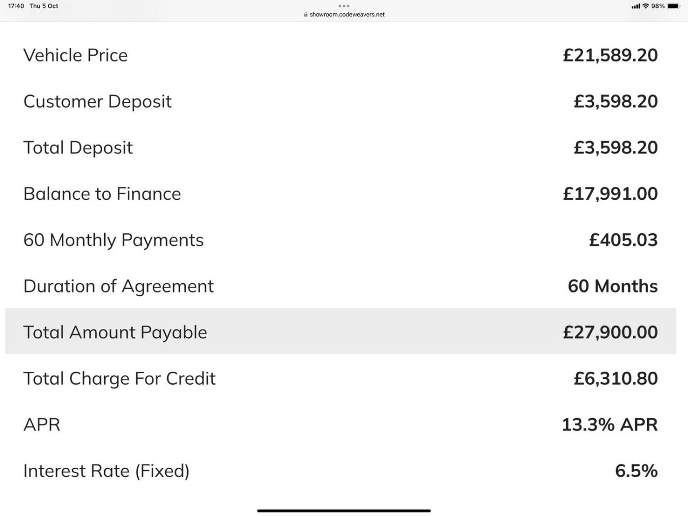 MONTHLY PAYMENT £405.03 x 60 AT 13.3 % APR £93.46 PER WEEK. Full breakdown of this quote in pictures.