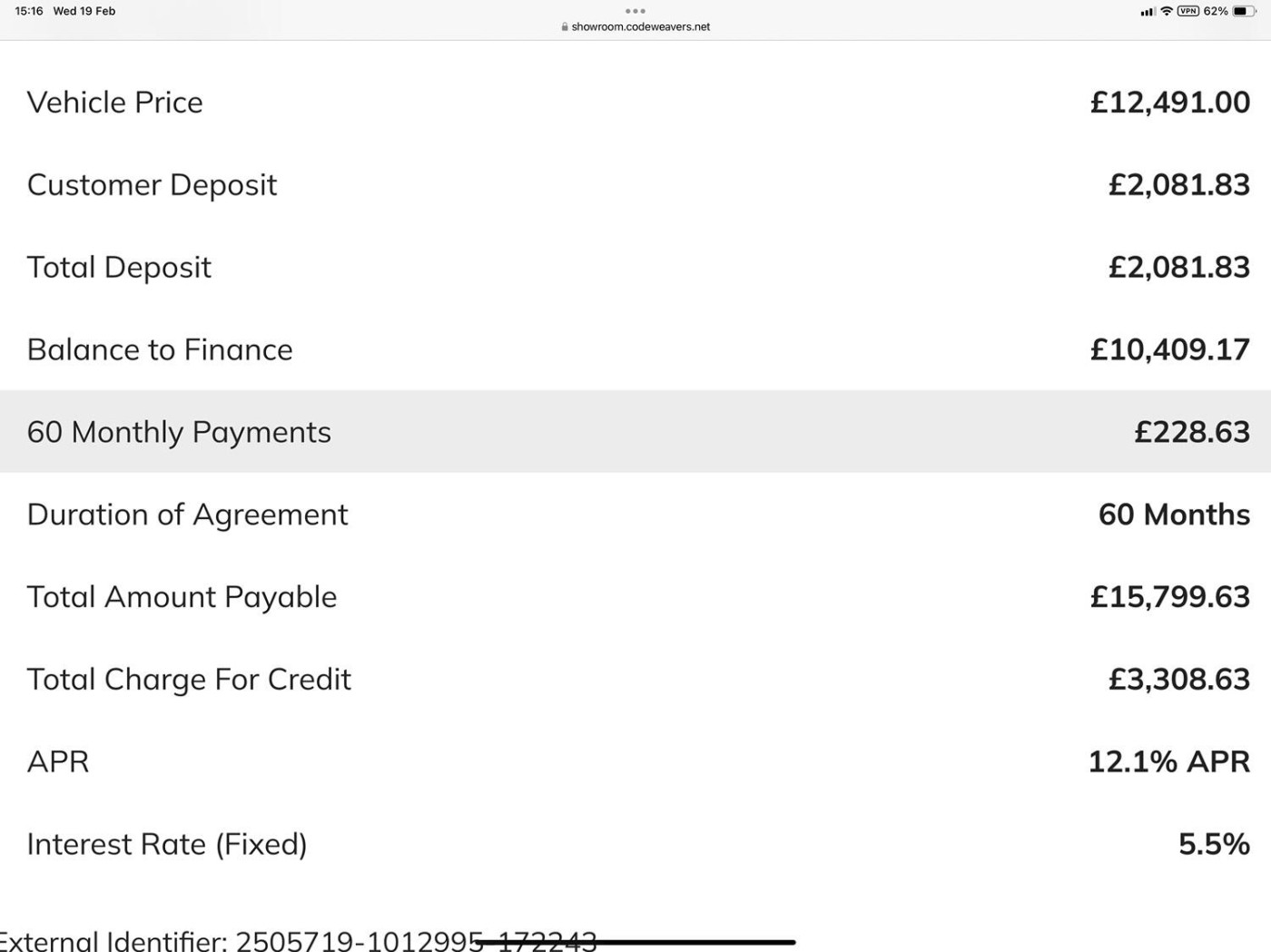 MONTHLY PAYMENT £228.63 x 60 AT 12.1% APR Full breakdown of this quote in the pictures.