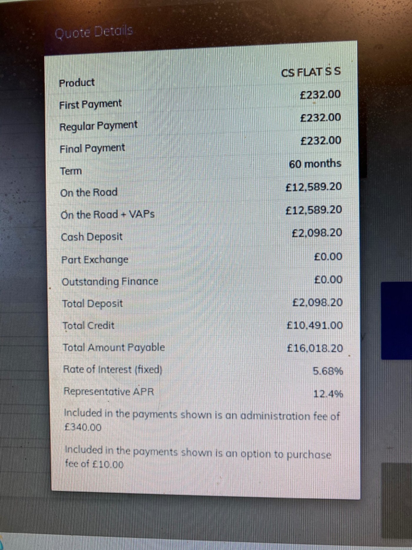 Payment £232 x 60 months at 12.4% APR £53.54 PER WEEK.