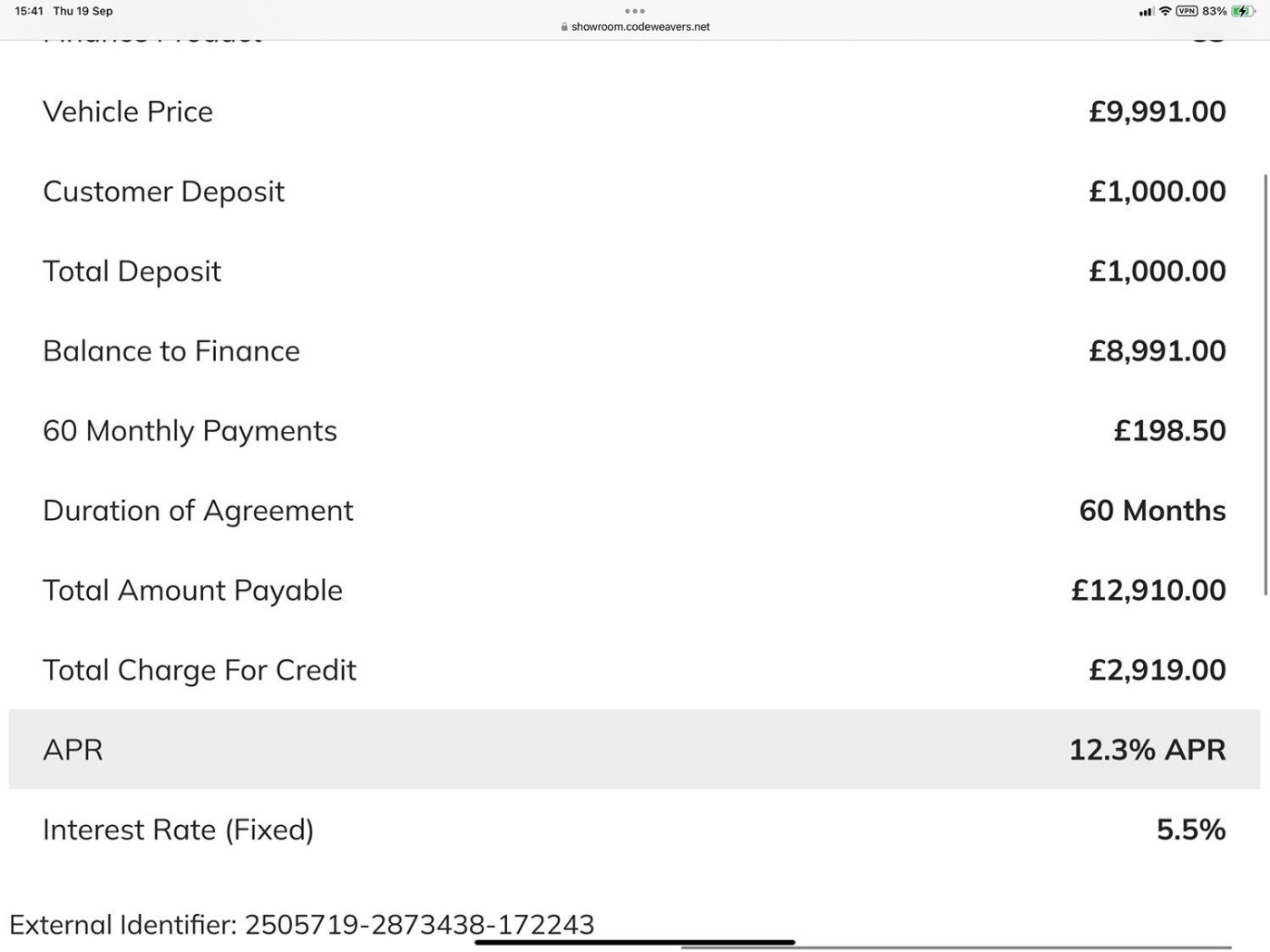 MONTHLY PAYMENT £198.50 x 60 AT 12.3% APR Full breakdown of this quote in the pictures.