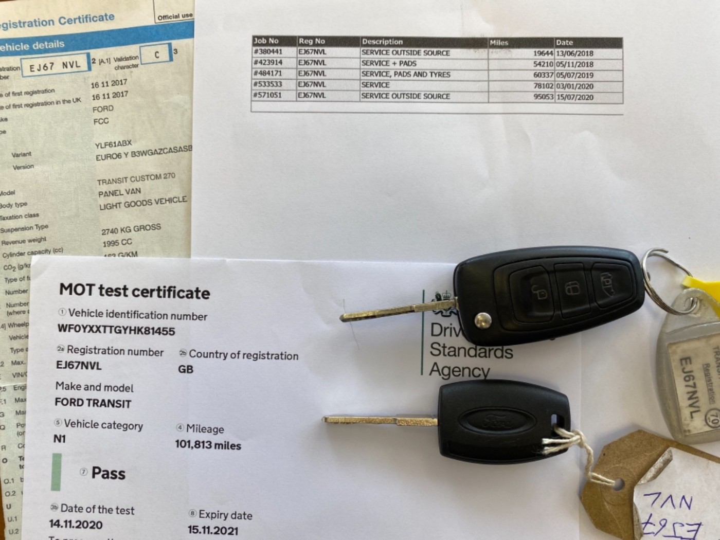 1st registered 16/11/2017, Euro 6 Transit Custom. A one owner van with full service history - there are 5 entries on the service printout. The last service was done at 95k on 15/07/20. The advertised price will include an oil service.