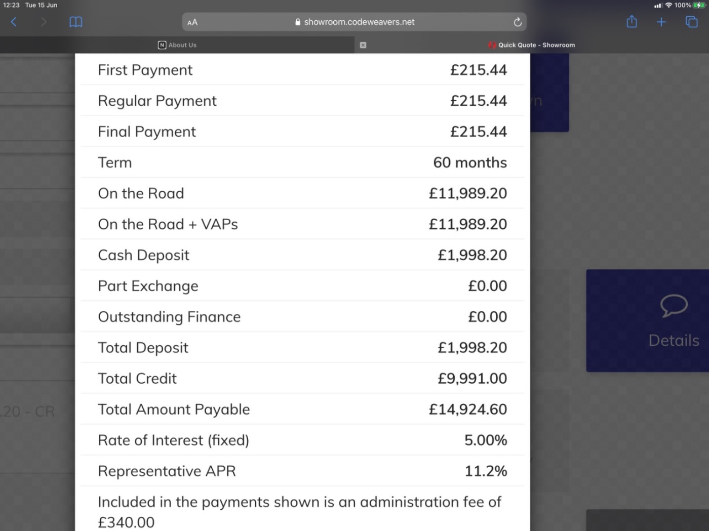 MONTHLY PAYMENT £215.44 x 60 AT 11.2% APR Full breakdown of this quote in the pictures.