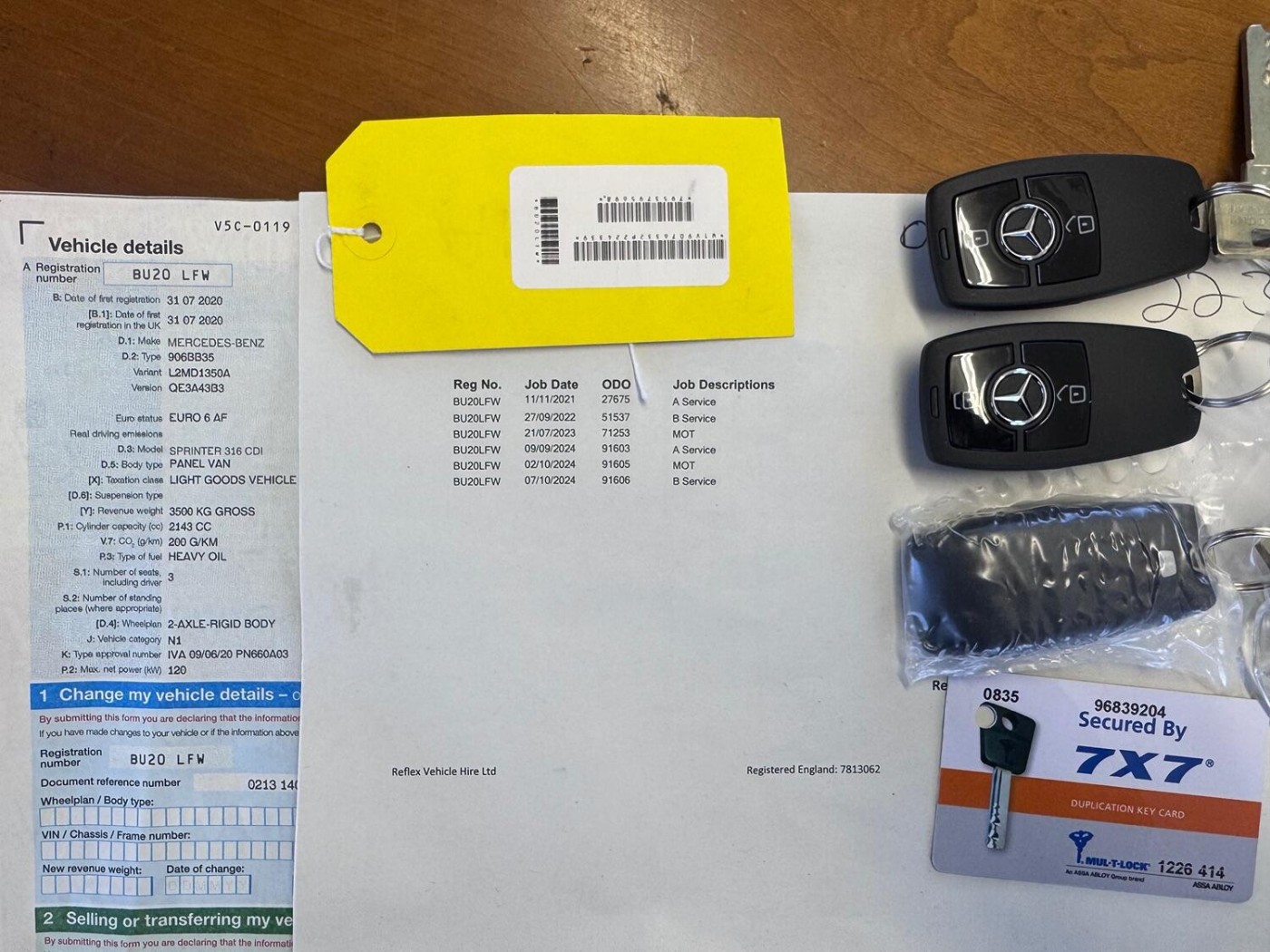 The van comes with three remote keys + some keys for the extra security locks. We have a service printout showing services at 27675 miles, 51537 miles and the most recent at 91606 miles. The MOT expires in October 2025.