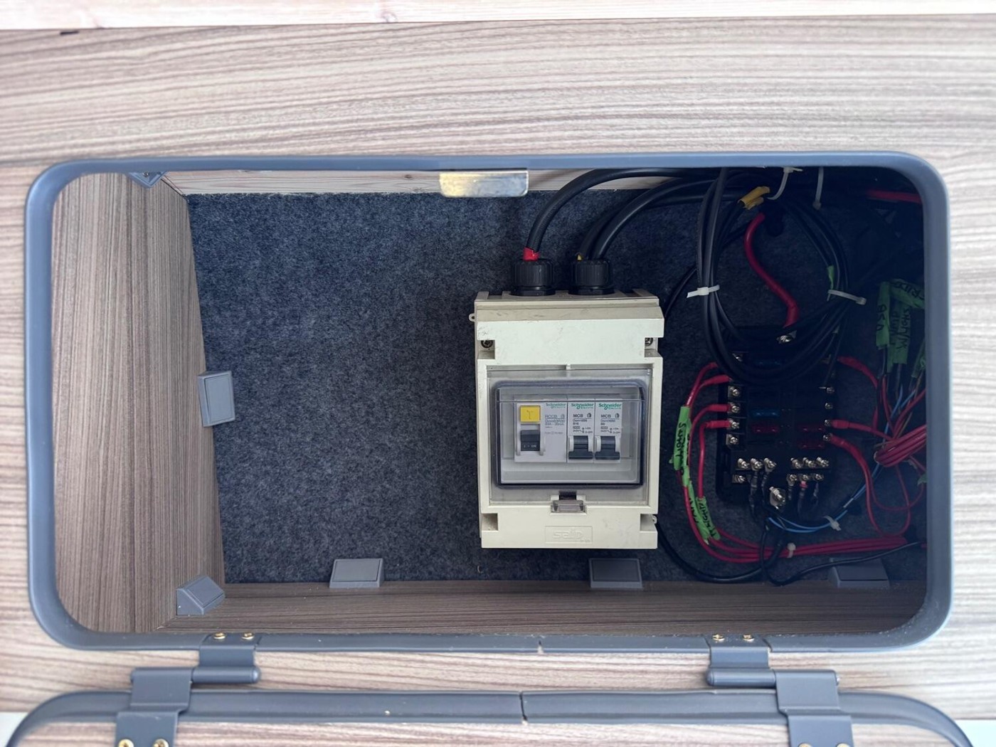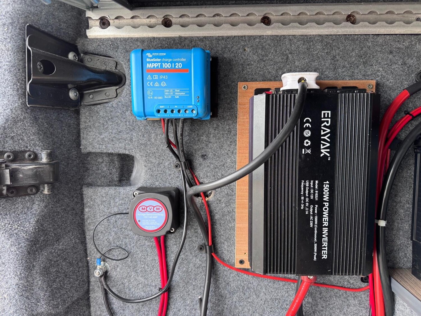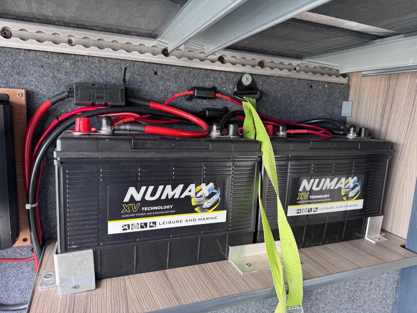 This van has off grid capability- There's a solar panel on the roof powering a Victron MPPT controller , this feeds into two large leisure batteries. The 1500W inverter allows you to use mains 240v appliances. The van is also fitted with a split charger and mains hook up.