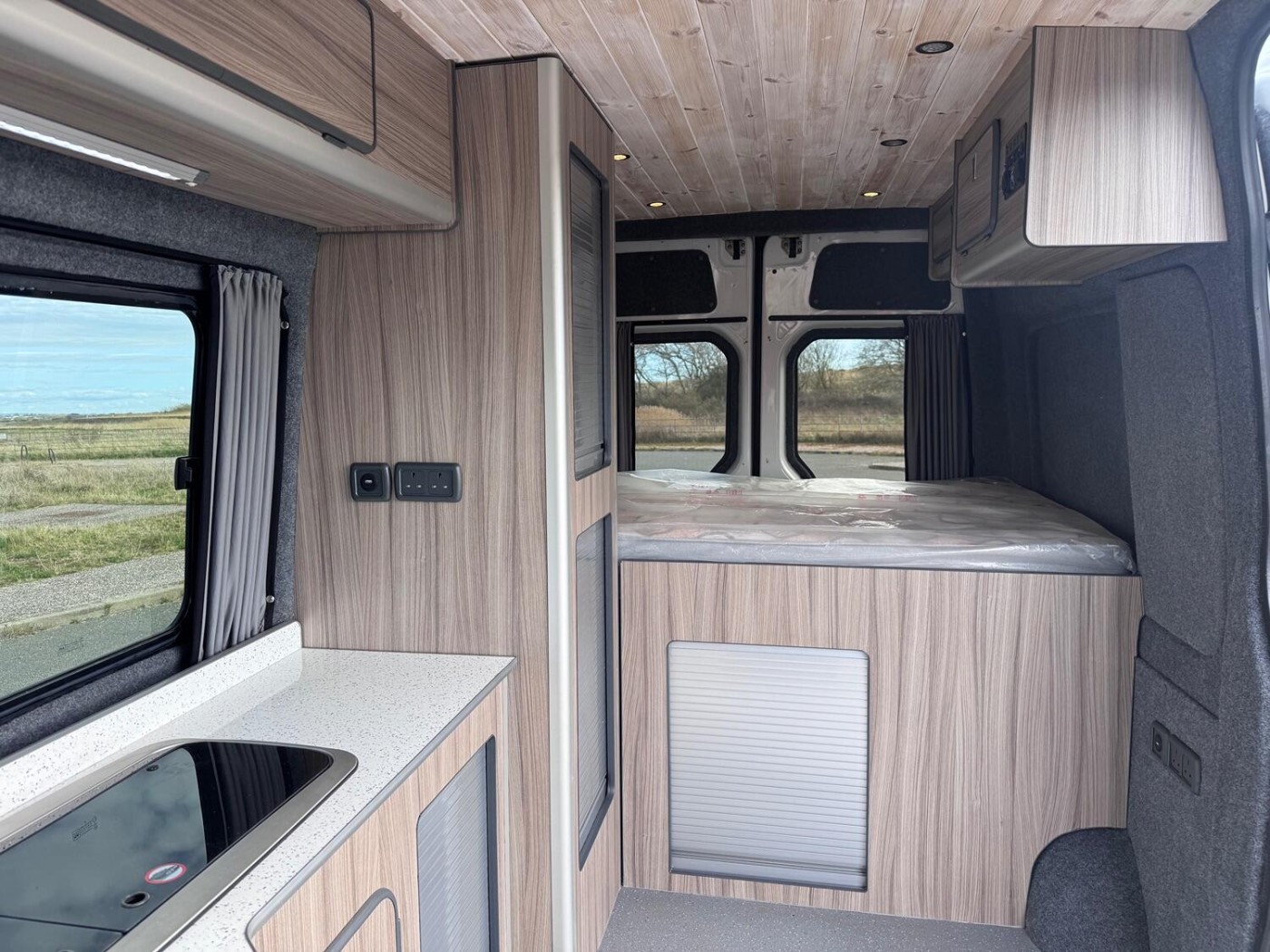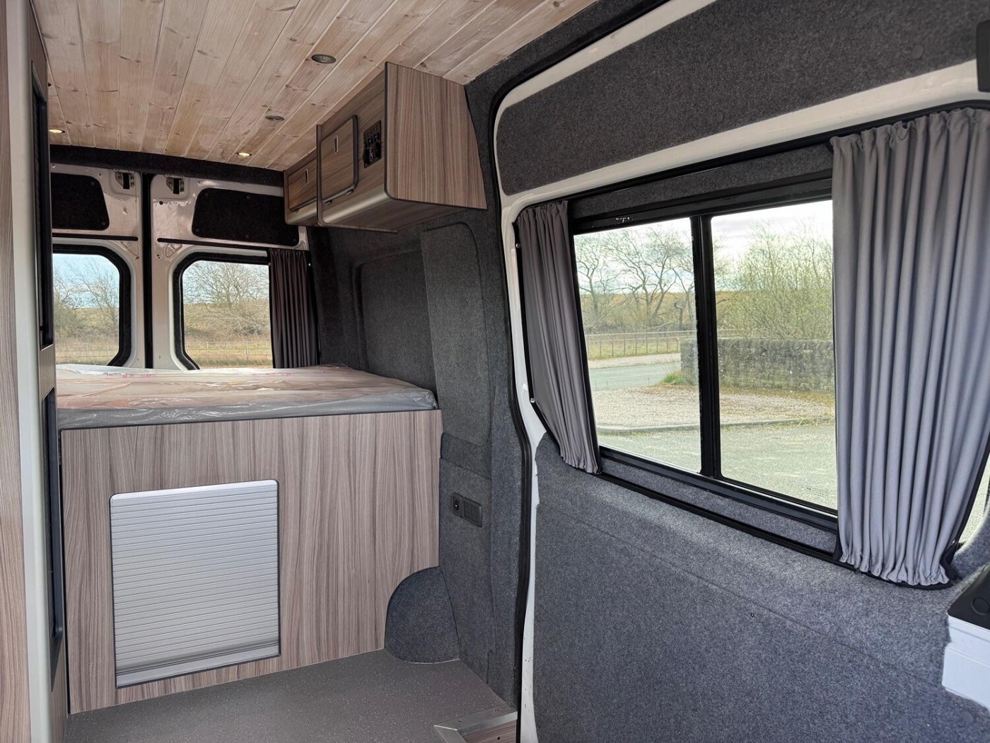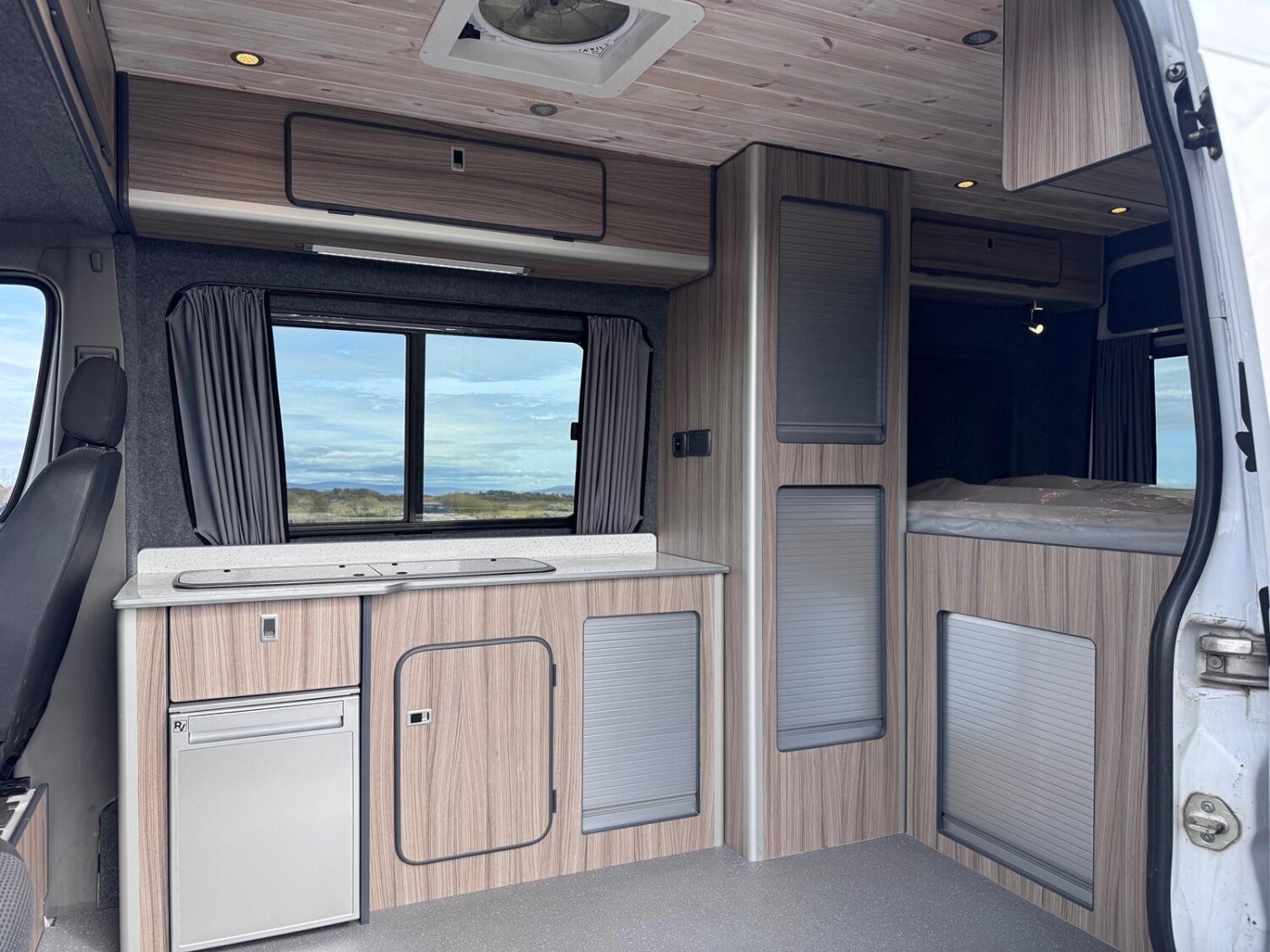 A good spec two berth campervan direct from the camper builder. The MWB van is the perfect base van in my opinion, spacious but not too large on the road. There's plenty of head height in this size van + lots of storage options. This van has had side pods added to make the double bed larger. There's over 190cms ( 6ft 4 in) between the walls now. Under the bed is a huge storage area that houses the electrical system. There are opening windows on the side loading door and opposite panel by the kitchen. The rear doors are glazed. All rear windows are covered with black out blinds.