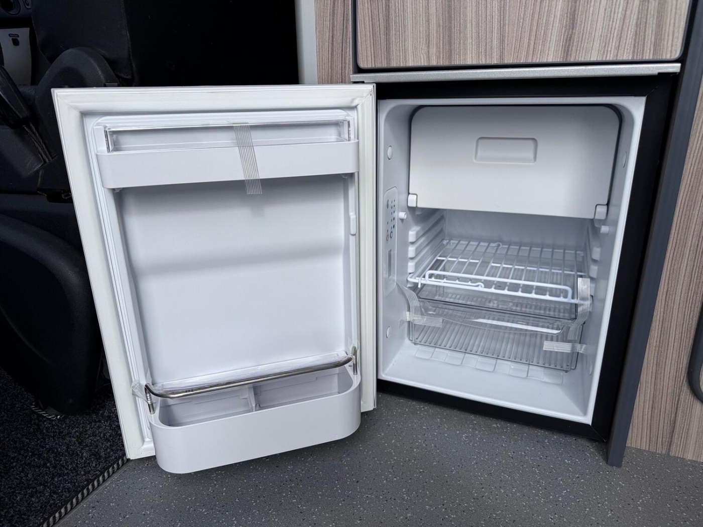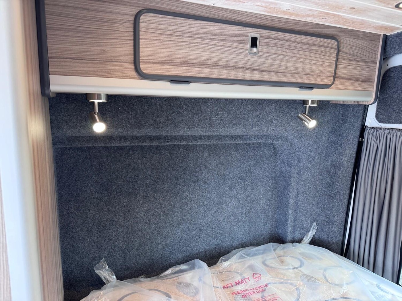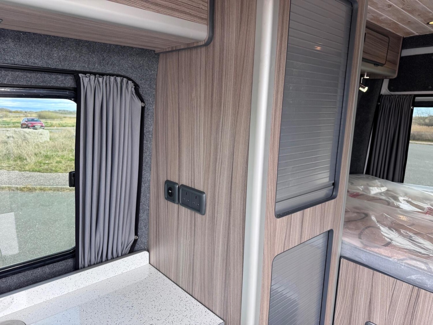 A good spec two berth campervan direct from the camper builder. The MWB van is the perfect base van in my opinion, spacious but not too large on the road. There's plenty of head height in this size van + lots of storage options. This van has had side pods added to make the double bed larger. There's over 190cms ( 6ft 4 in) between the walls now. Under the bed is a huge storage area that houses the electrical system. There are opening windows on the side loading door and opposite panel by the kitchen. The rear doors are glazed. All rear windows are covered with black out blinds.
