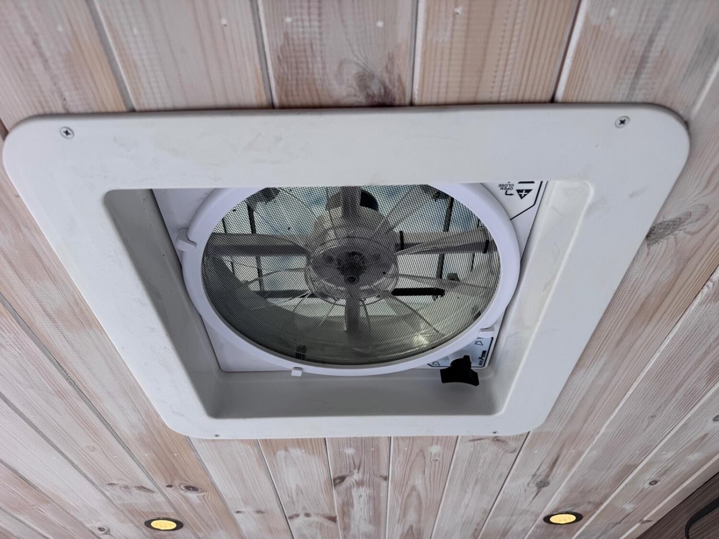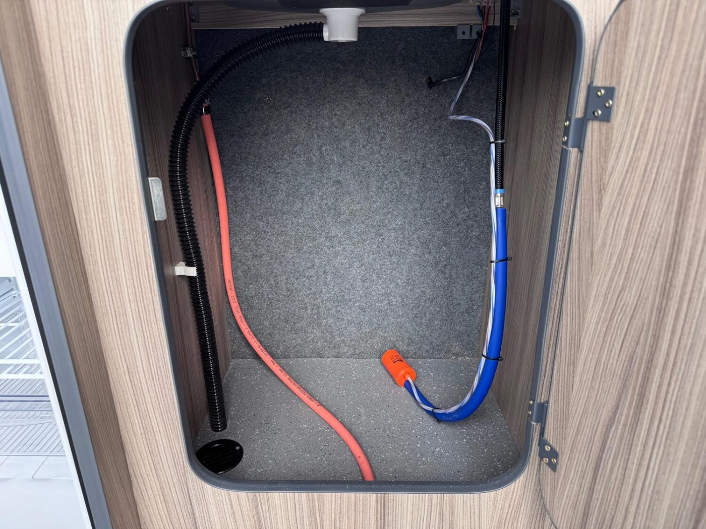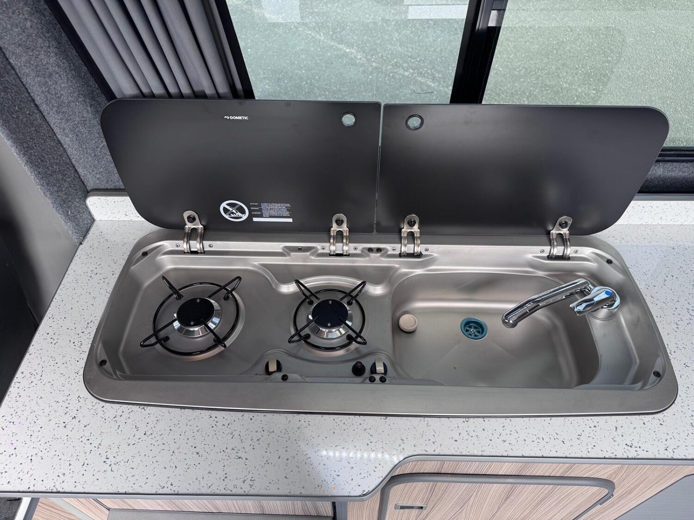 The kitchen is fitted with a Dometic two ring gas hob and sink unit + a 12v fridge. There's a strip light over the kitchen. Overhead is an electric Maxxfan. The real wood ceiling houses 10 LED spotlights that can be used independently, over the bed there are two reading lights. The bespoke furniture is crafted from light weight Zebrano Ply.