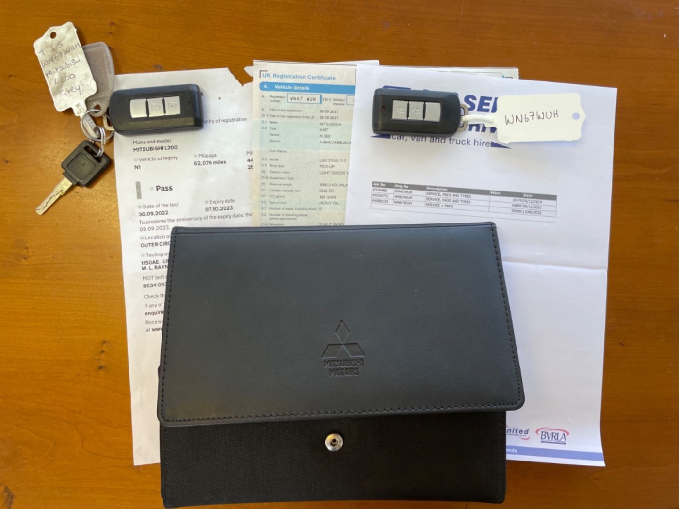 The L200 comes with two keys, complete tool kit including locking wheel nut, handbooks + a service printout. The pickup's been serviced three times at 18k, 44k and 56k. The current mileage is 63403. A new clutch has just been fitted. The current MOT expires on 30/09/2023.