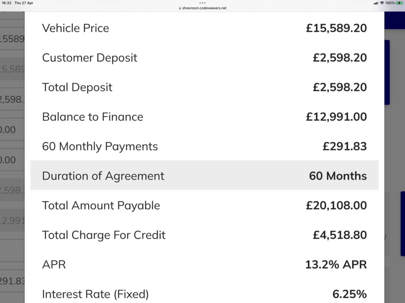 MONTHLY PAYMENT £291.83 x 60 AT 13.2% APR This is £67.35 per week. Full breakdown of this quote in pictures.