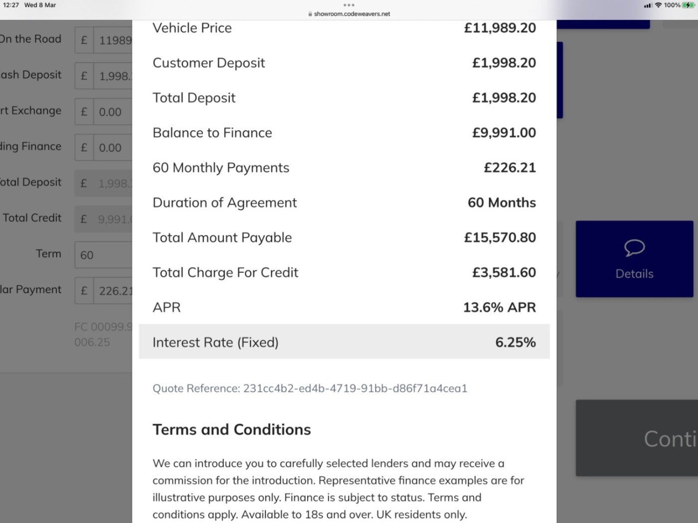 MONTHLY PAYMENT £226.21 x 60 AT 13.6 % APR £52.20 PER WEEK. Full breakdown of this quote in pictures.