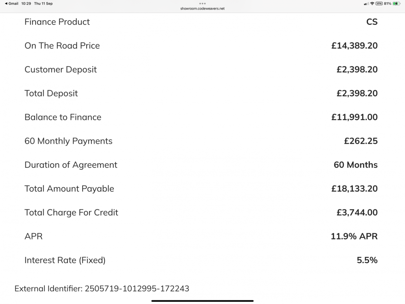 MONTHLY PAYMENT £262.25 x 60 AT 11.9% APR Full breakdown of this quote in pictures.