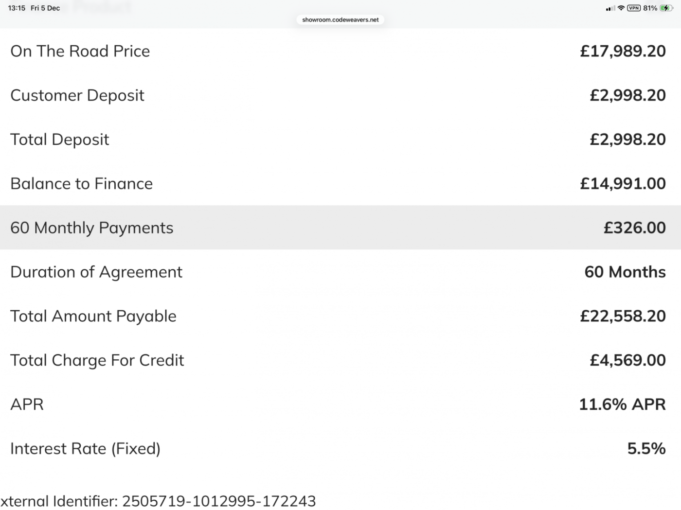 MONTHLY PAYMENT £326 x 60 AT 11.6 % APR Full breakdown of this quote in the pictures.