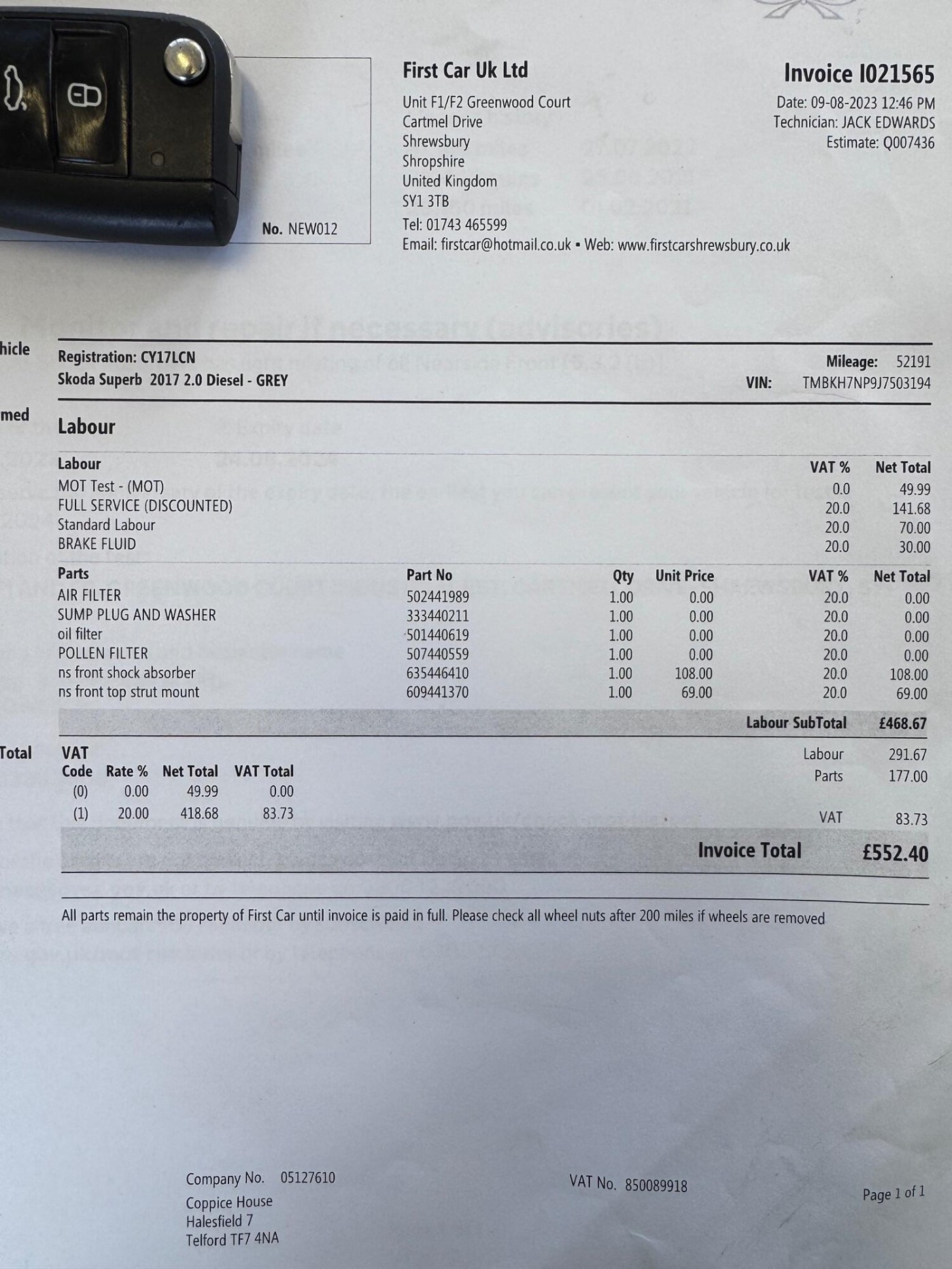 09/08/2023 @ 52191 Miles.- Service and MOT.