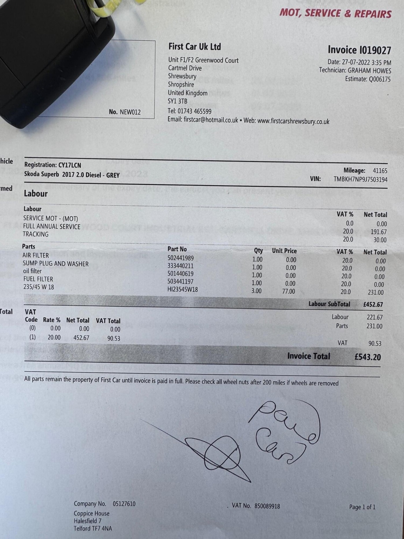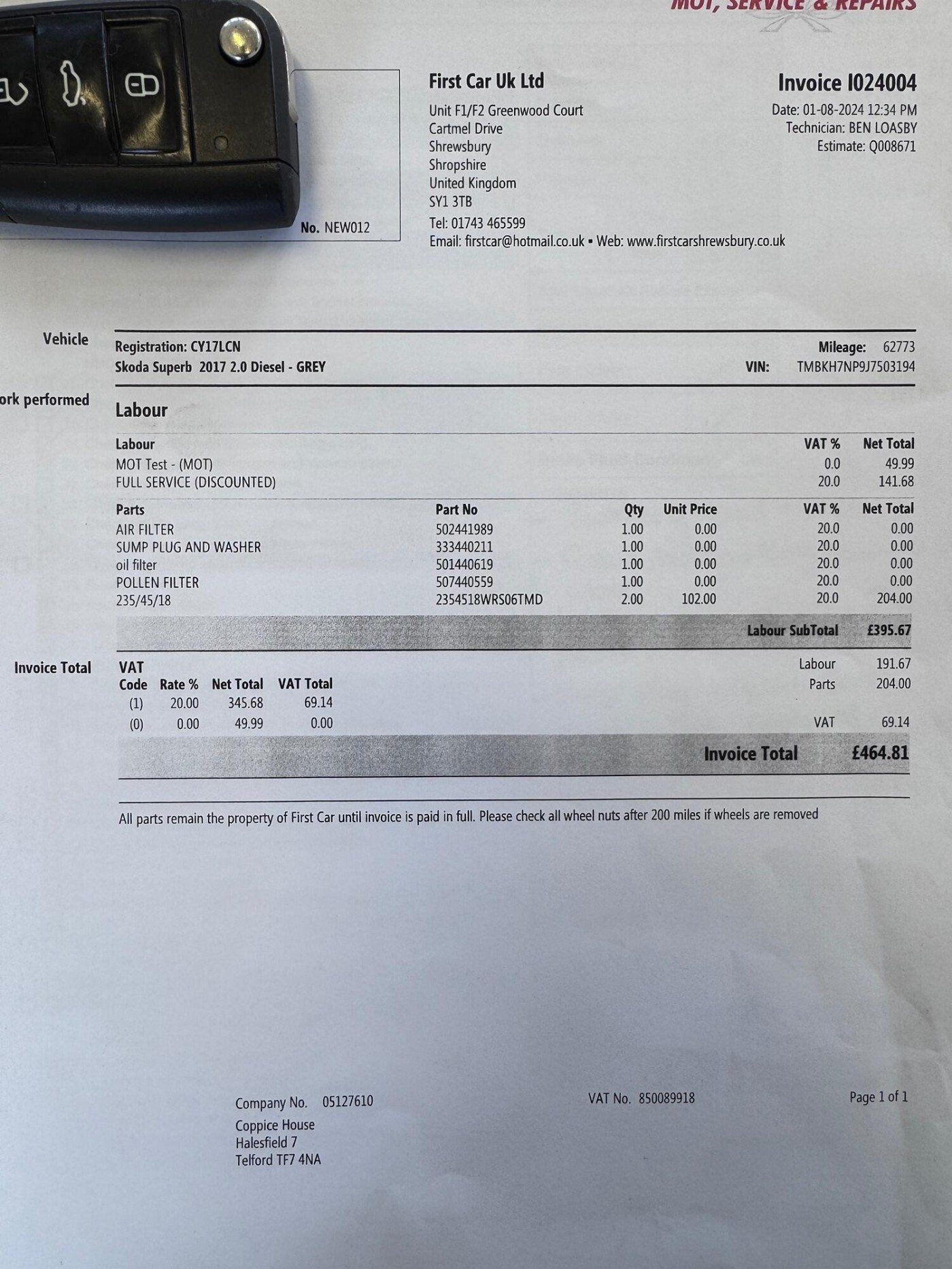01/08/2024 @ 62773 Miles. Service and MOT.