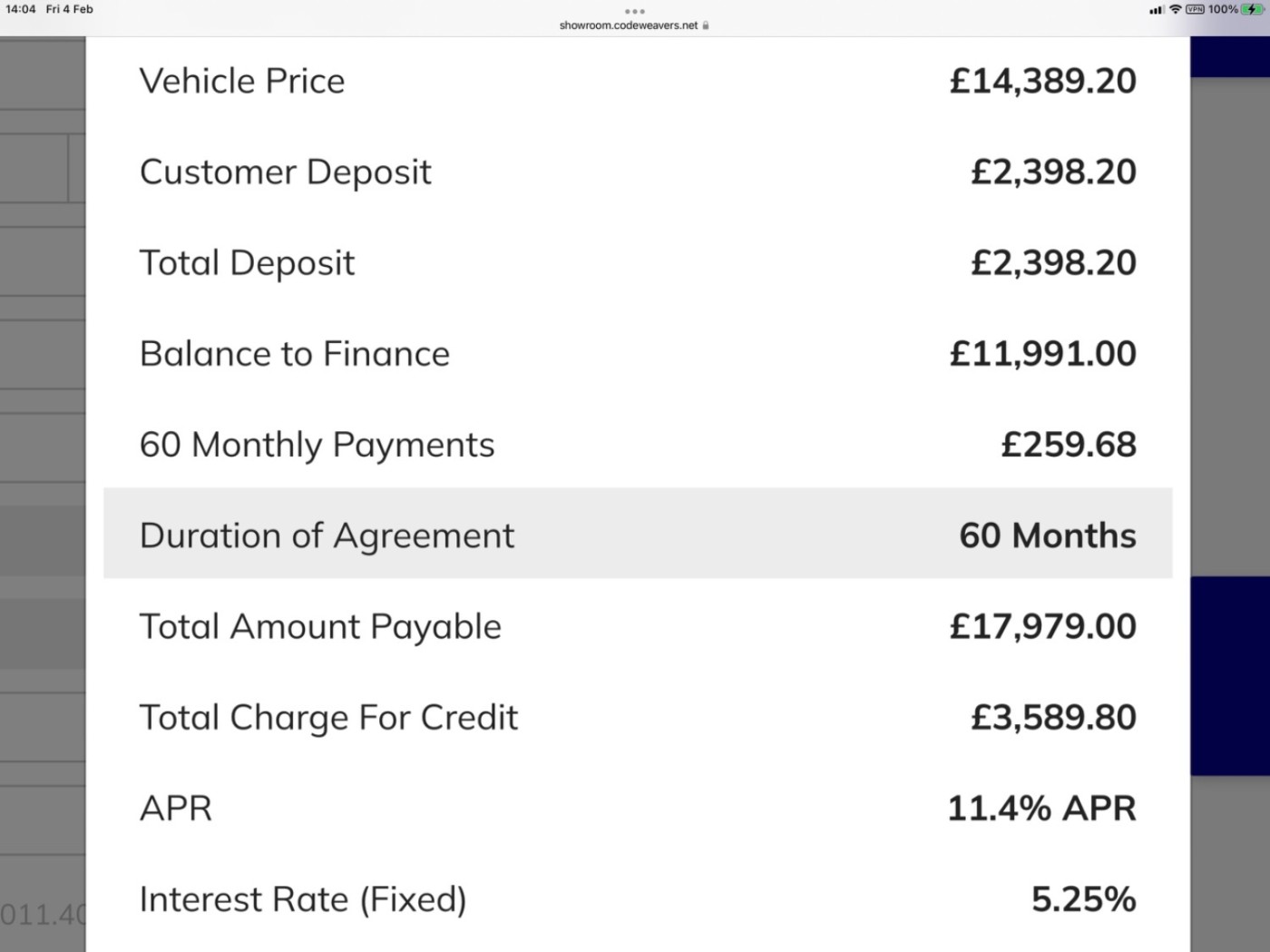 Payment £259.68 x 60 months at 10.8% APR - £59.93 PER WEEK.