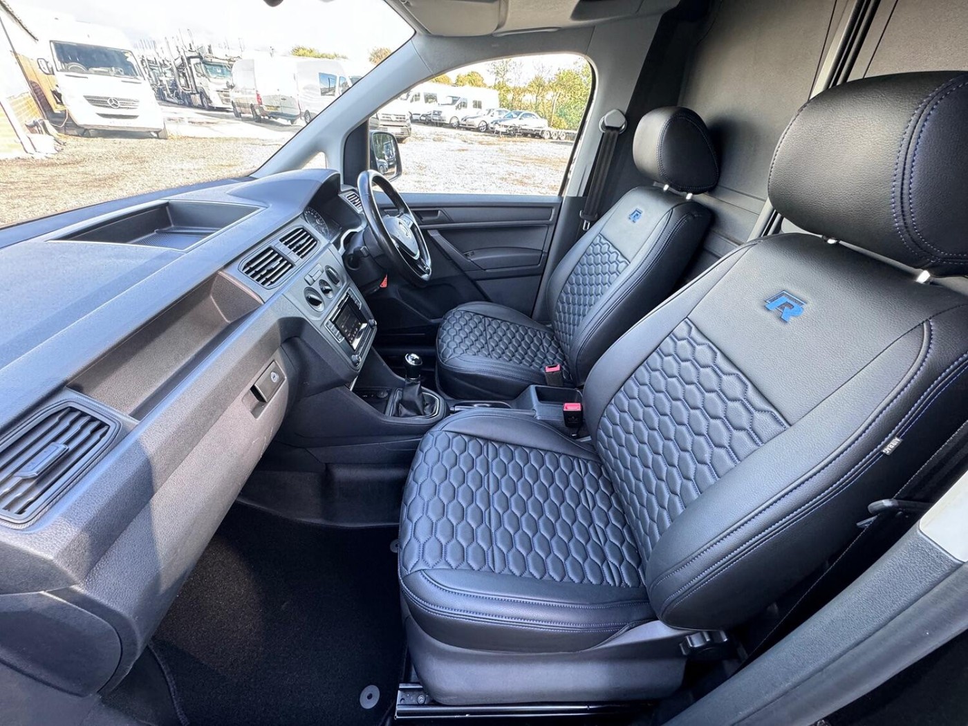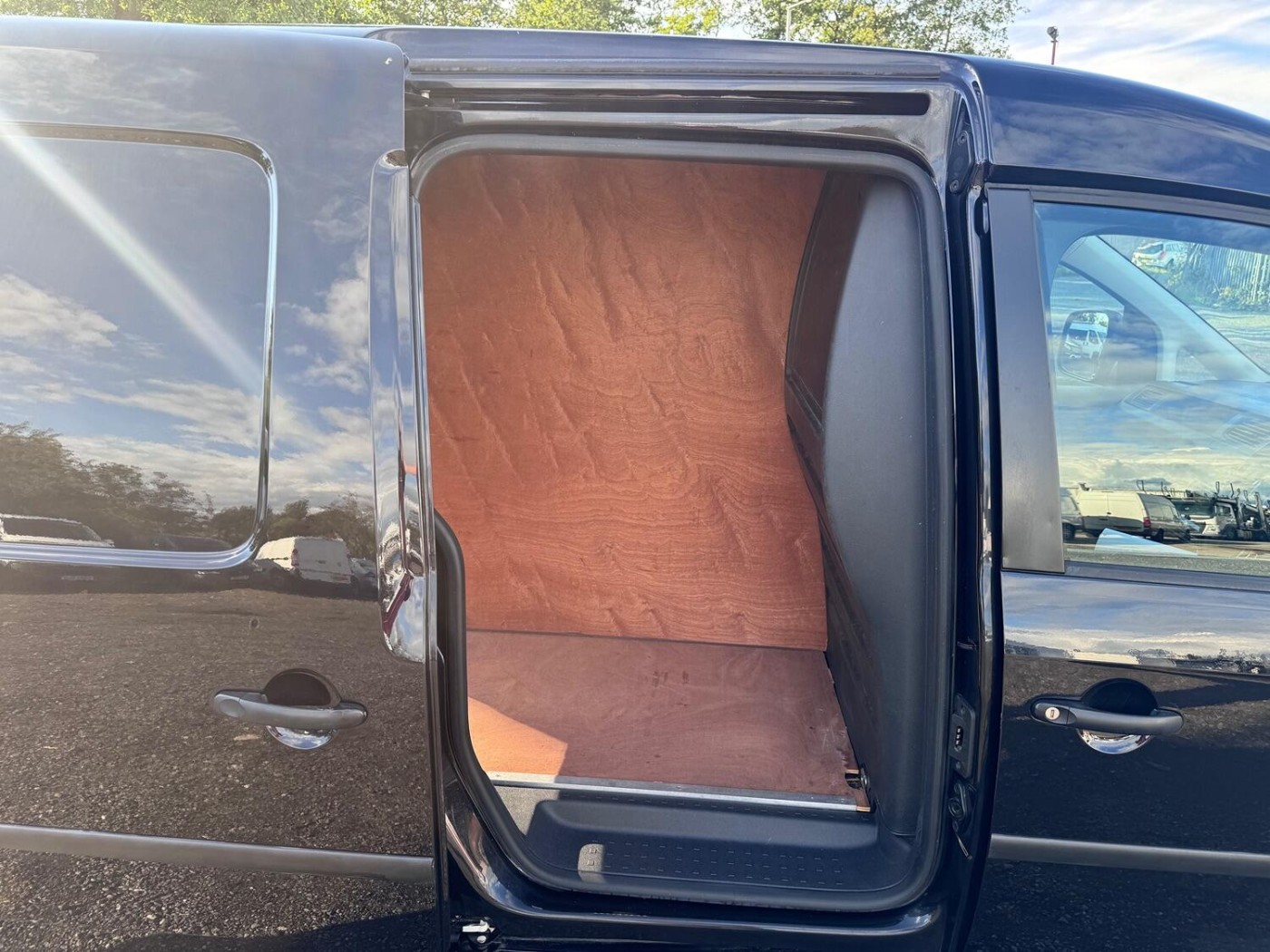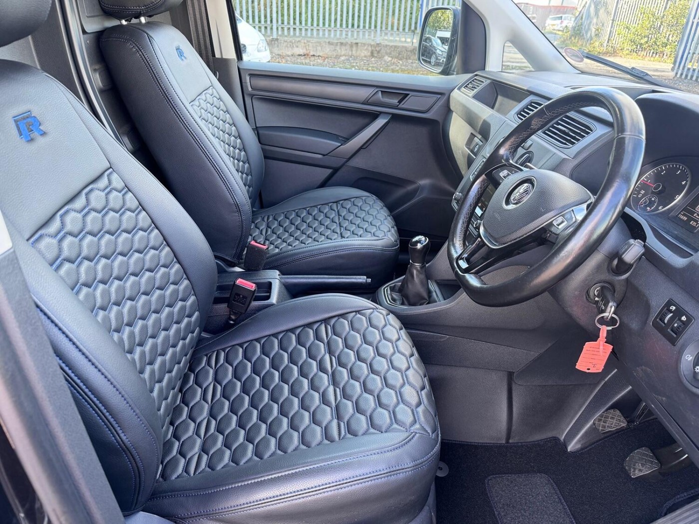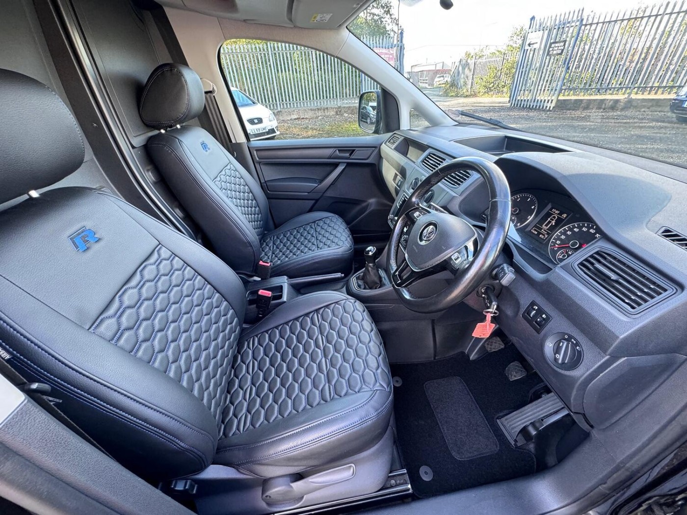 A lovely example of the VW Caddy Maxi (LWB). This van is finished in gleaming metallic Black with matching black interior. The blue stitched R design seat covers create a real classy sporty look in the cabin. This van has a tailgate instead of barn doors - a very rare and sought after option.