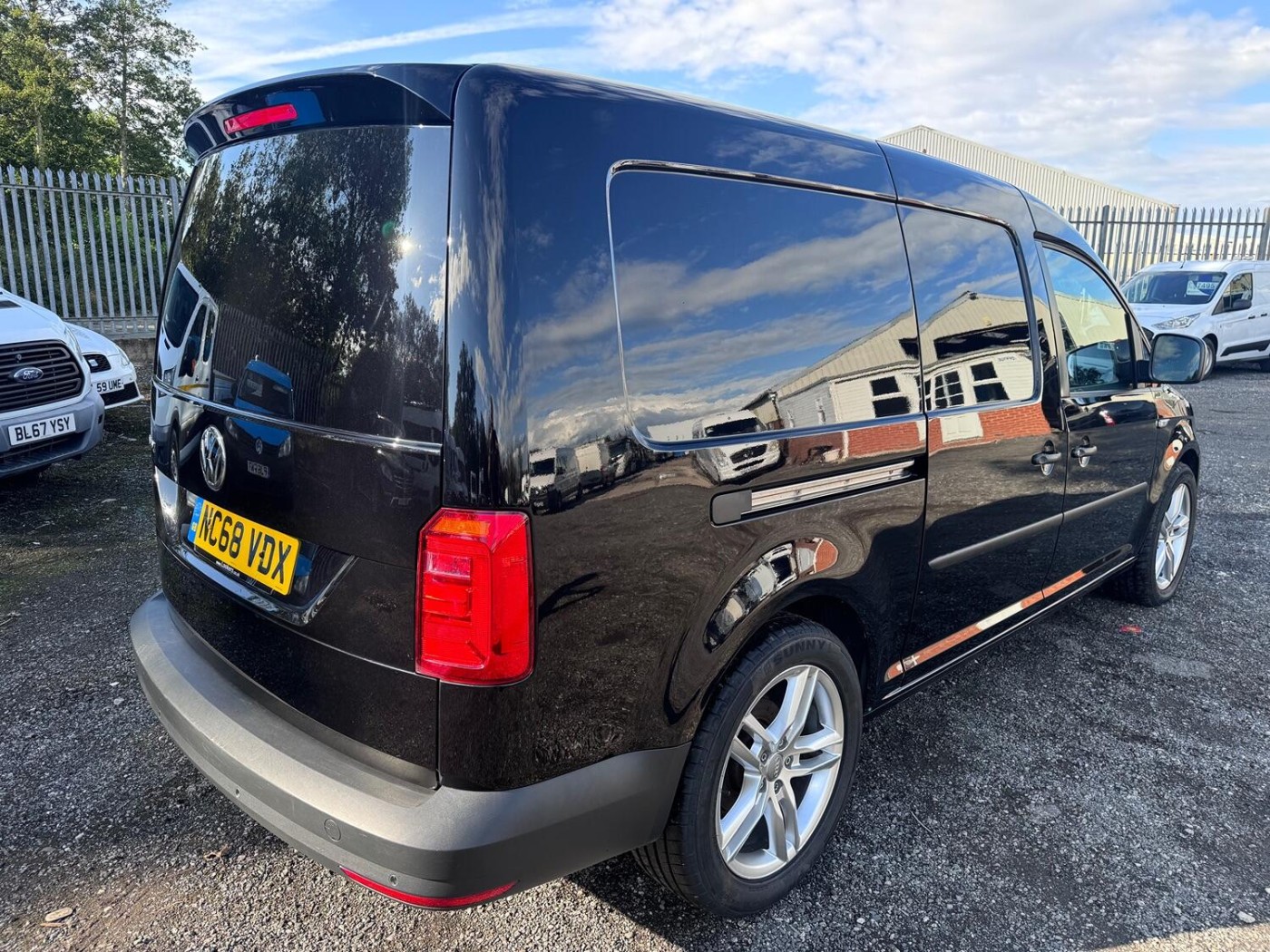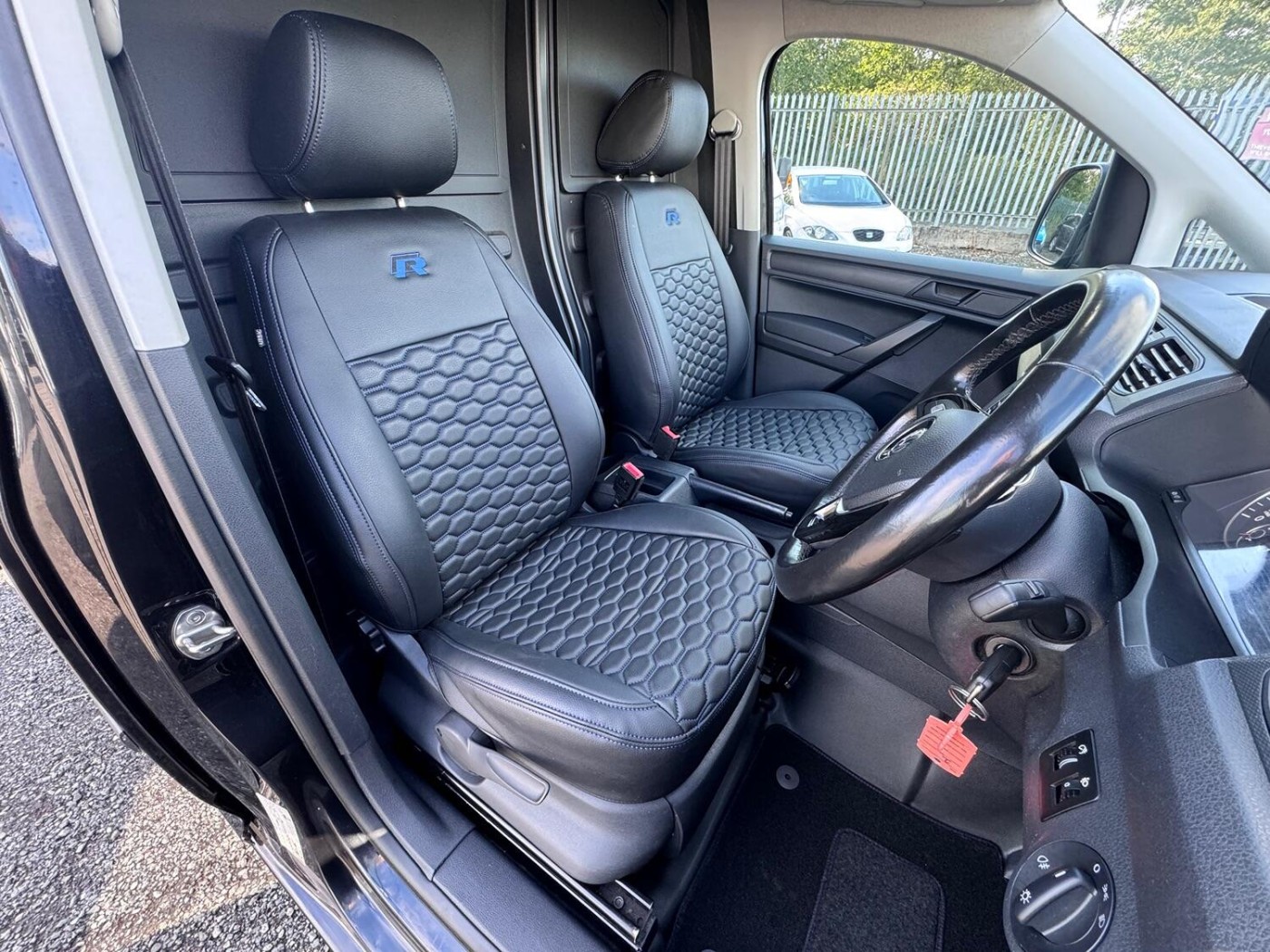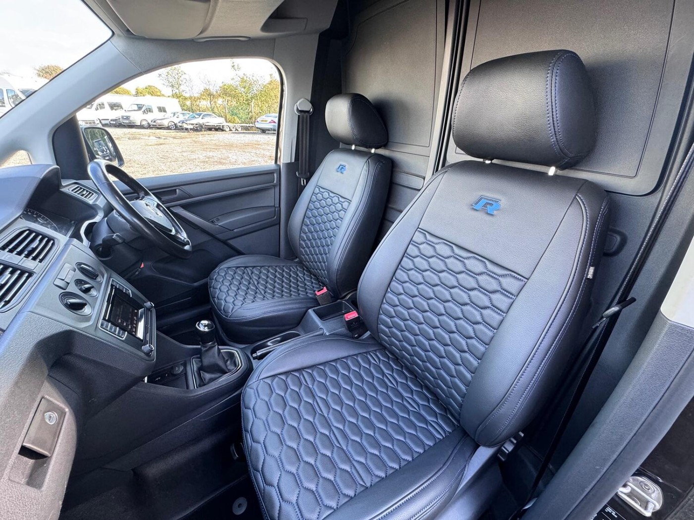 A lovely example of the VW Caddy Maxi (LWB). This van is finished in gleaming metallic Black with matching black interior. The blue stitched R design seat covers create a real classy sporty look in the cabin. This van has a tailgate instead of barn doors - a very rare and sought after option.