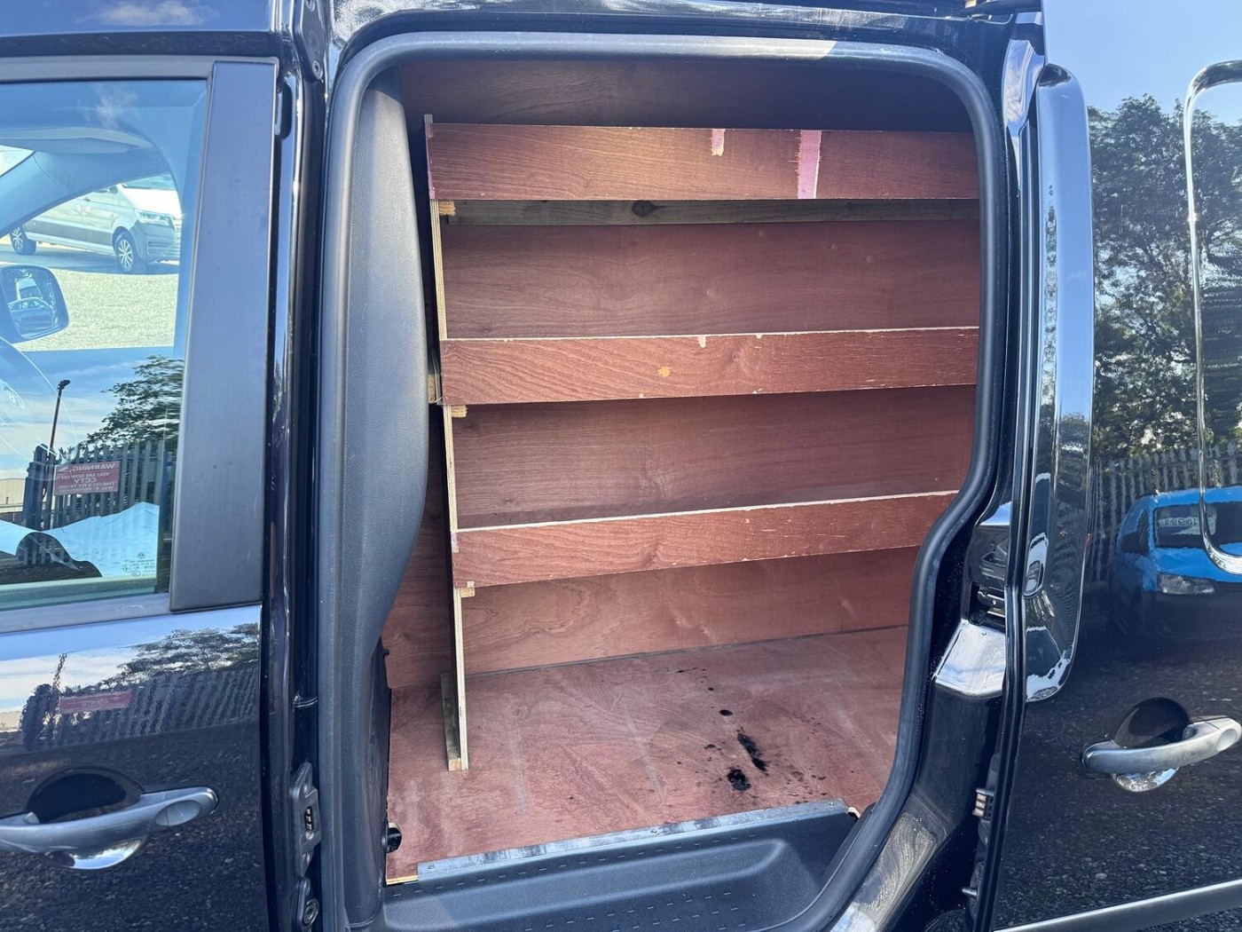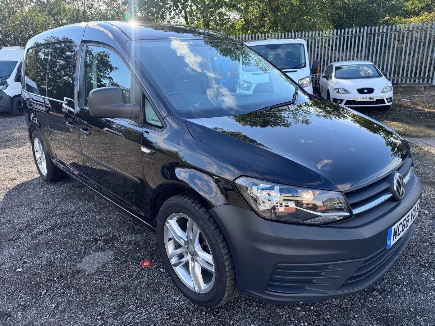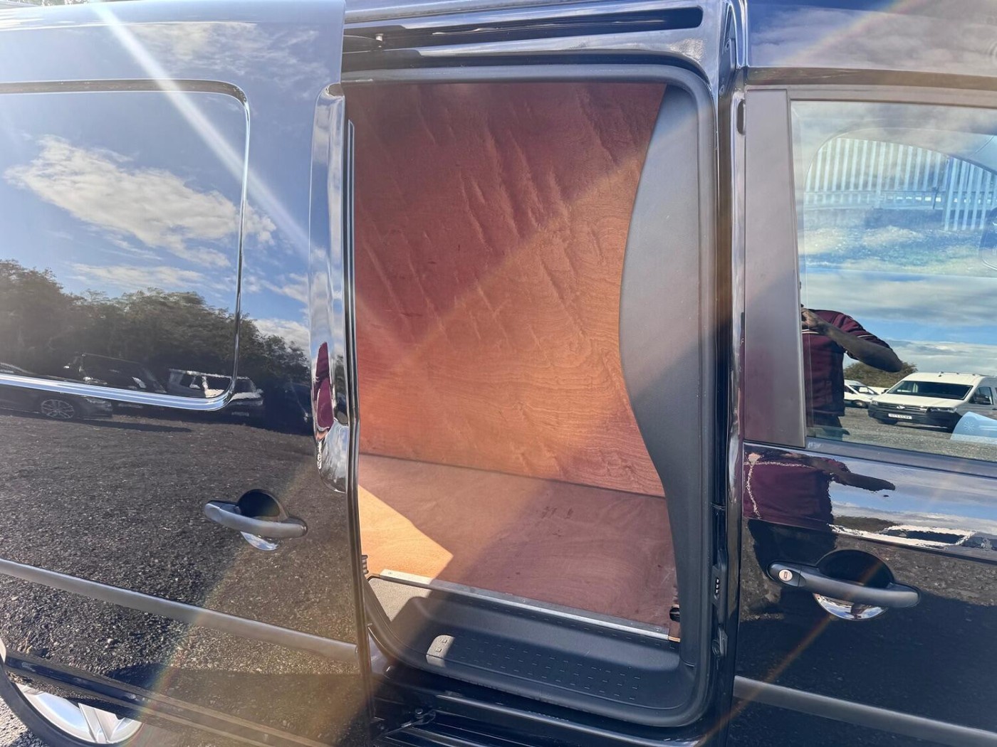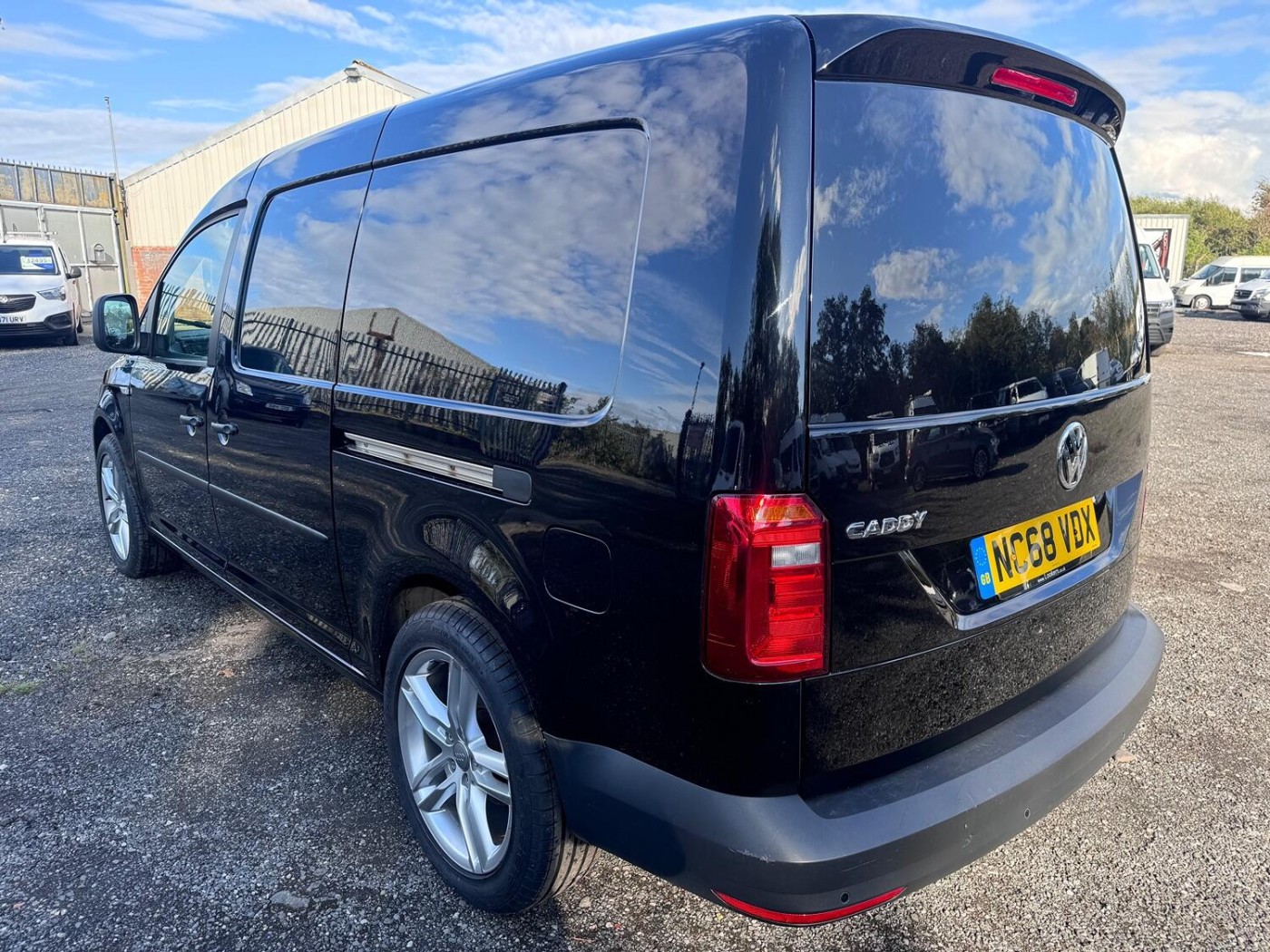 A lovely example of the VW Caddy Maxi (LWB). This van is finished in gleaming metallic Black with matching black interior. The blue stitched R design seat covers create a real classy sporty look in the cabin. This van has a tailgate instead of barn doors - a very rare and sought after option.