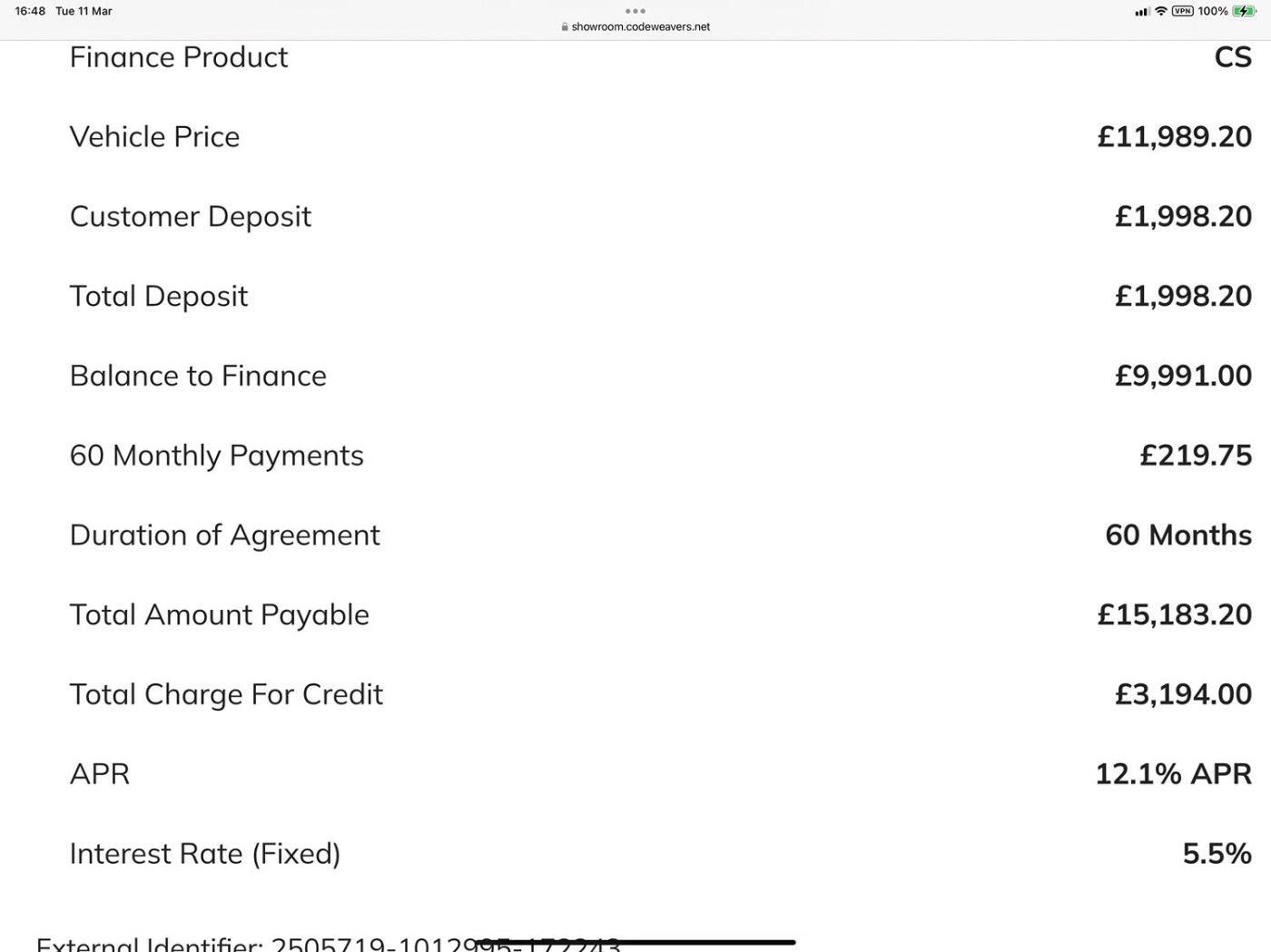 MONTHLY PAYMENT £219.75 x 60 AT 12.1% APR Full breakdown of this quote in the pictures.