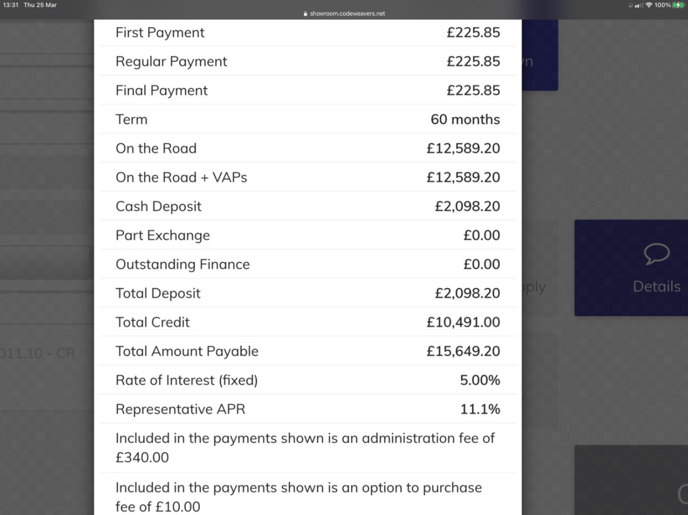 MONTHLY PAYMENT £225.85 x 60 AT 11.1% APR Full breakdown of this quote in pictures.