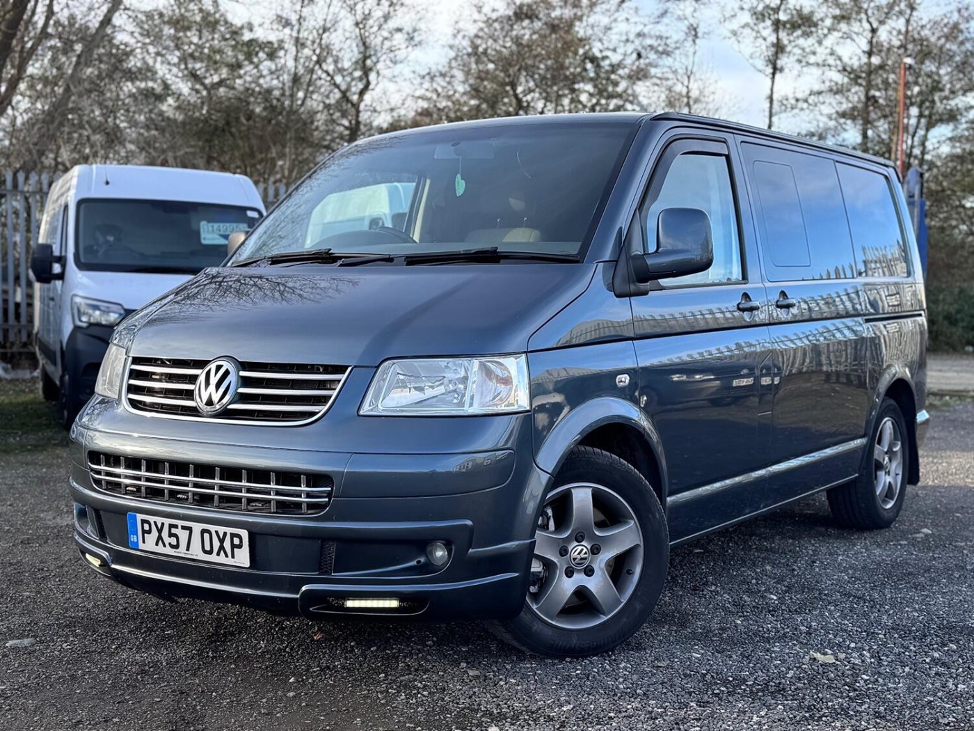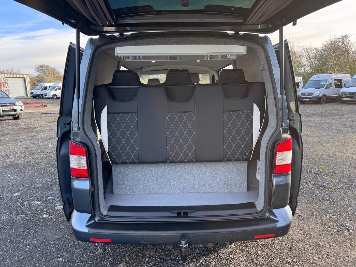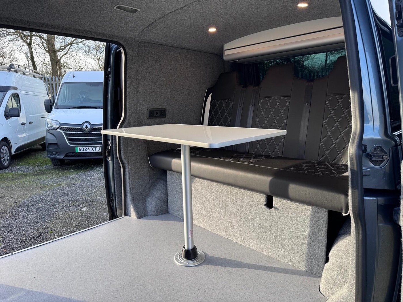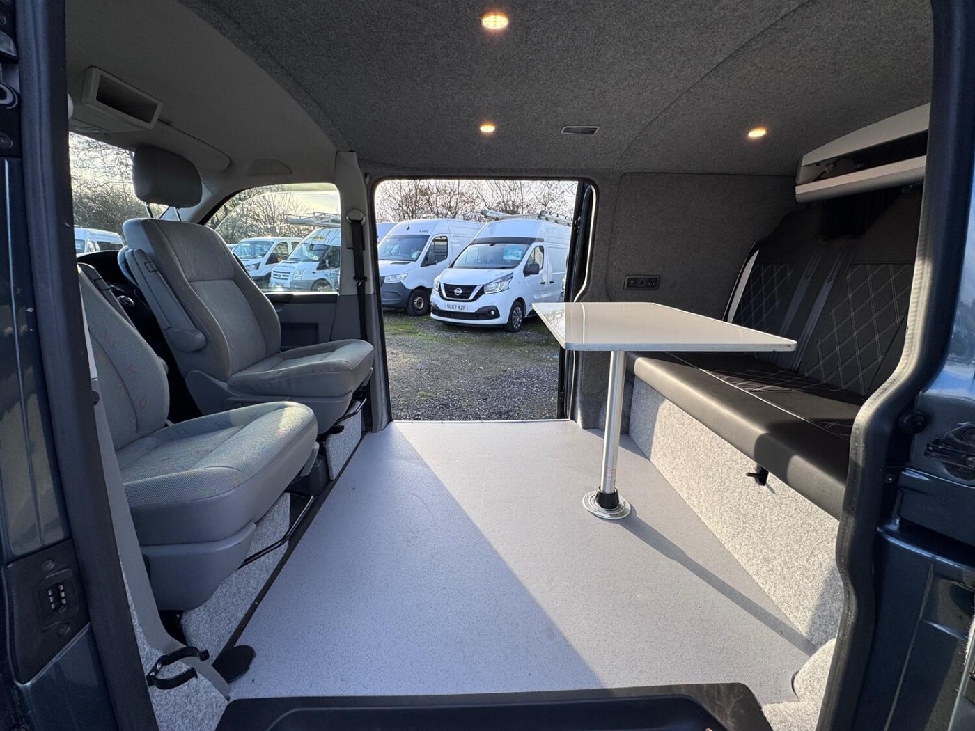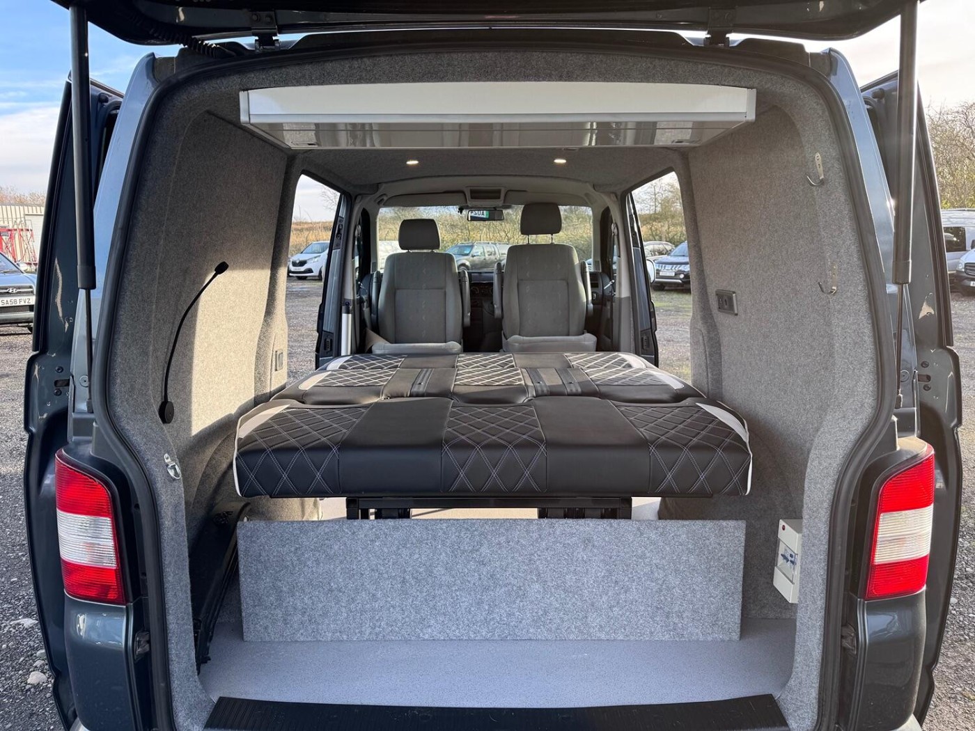 A real smart T5 van finished in Offroad Grey ( Green/Grey Metallic).This is a smart looking van- colour coded bumpers and alloy wheels give it a stylish modern look. The van has been converted into a day van with a full width Rock and Roll bed, picnic table, swivel front seats and electrics. This is a very nice job- I guess it's been done professionally. The van has LED lighting in the back and also along the awning rail. There is a mains hook up for on site use- with a battery charger to keep the 12v topped up.