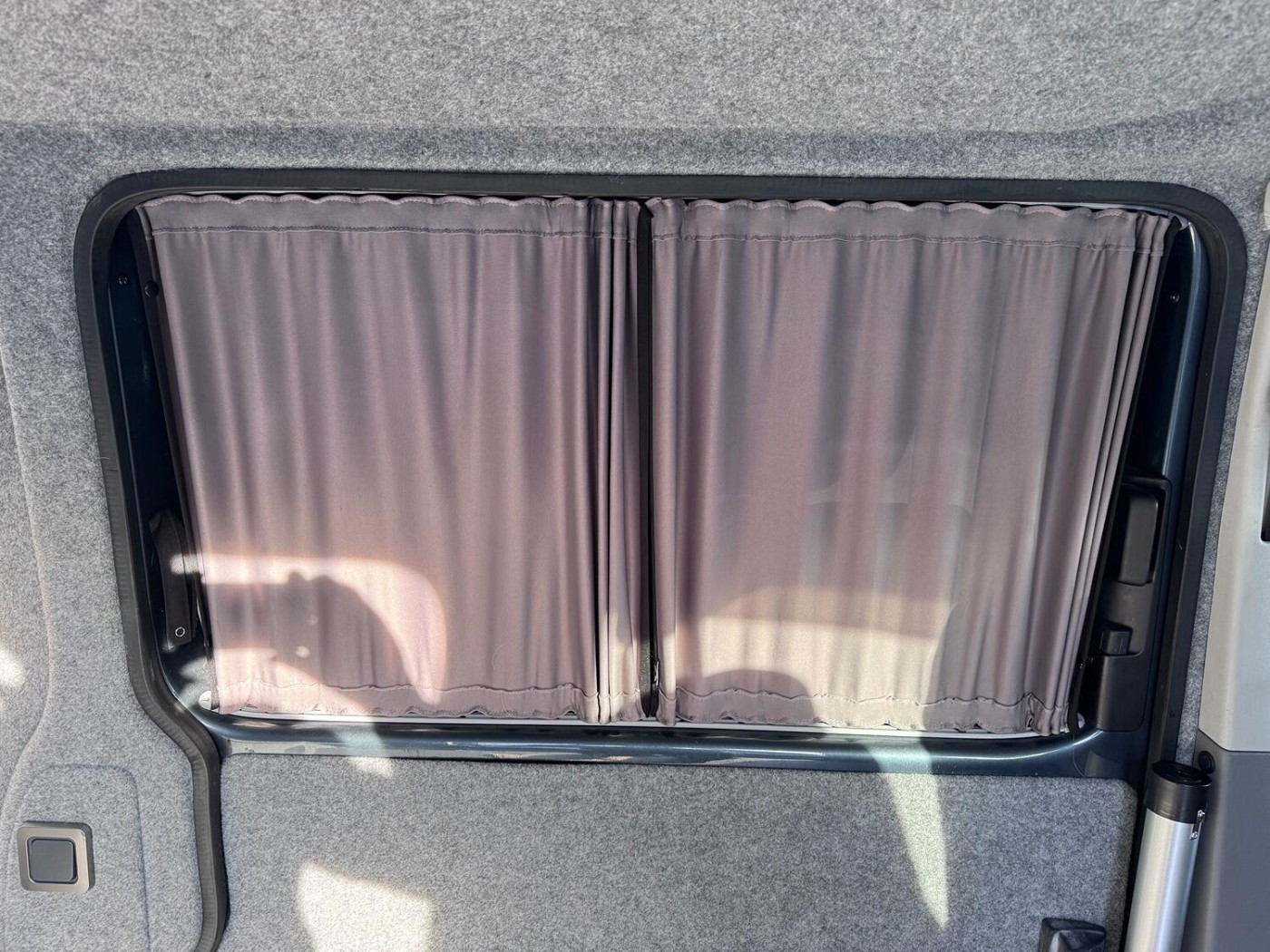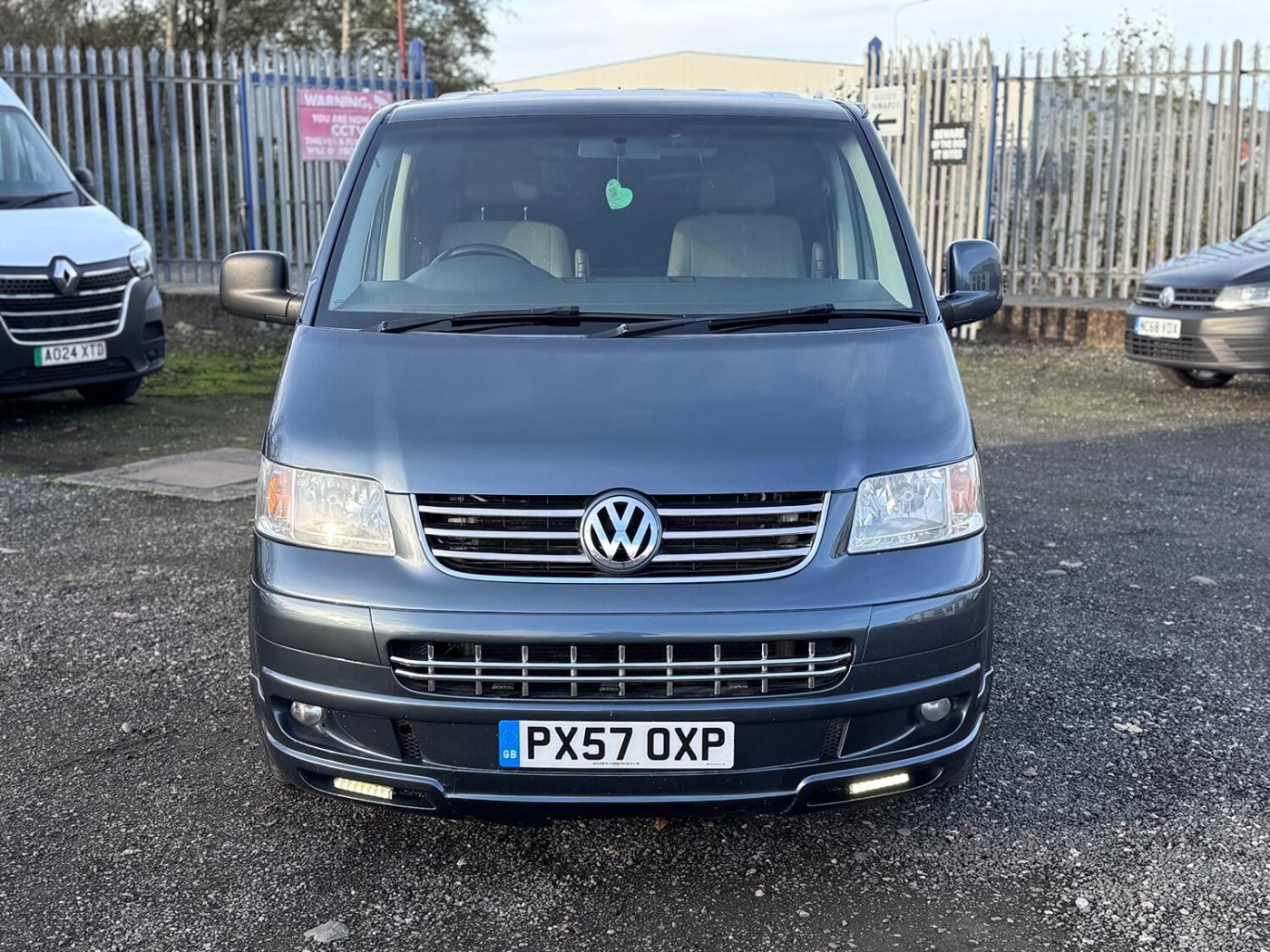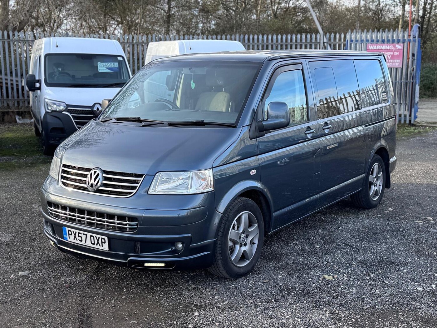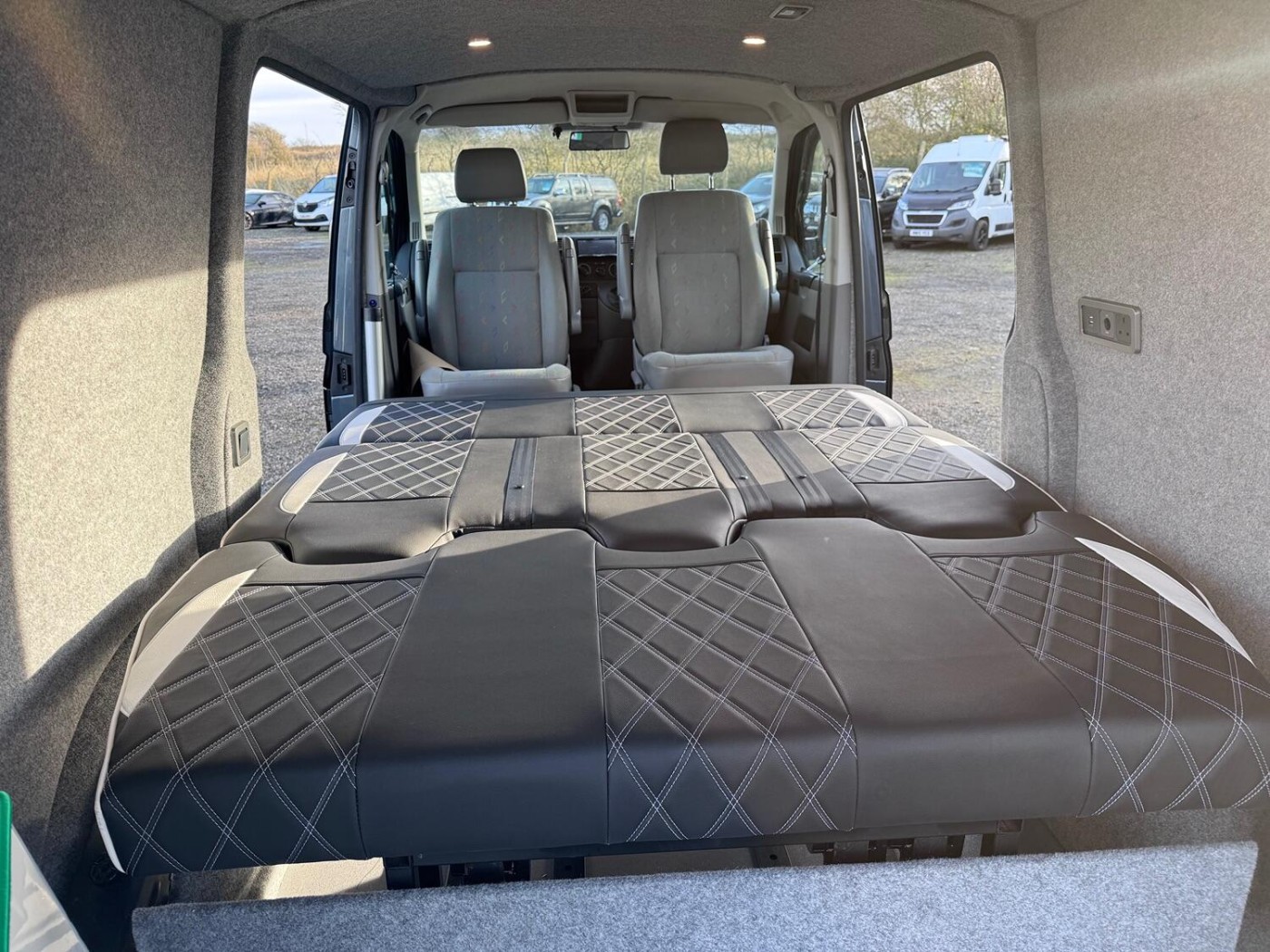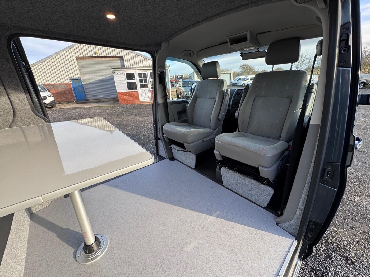 A real smart T5 van finished in Offroad Grey ( Green/Grey Metallic).This is a smart looking van- colour coded bumpers and alloy wheels give it a stylish modern look. The van has been converted into a day van with a full width Rock and Roll bed, picnic table, swivel front seats and electrics. This is a very nice job- I guess it's been done professionally. The van has LED lighting in the back and also along the awning rail. There is a mains hook up for on site use- with a battery charger to keep the 12v topped up.